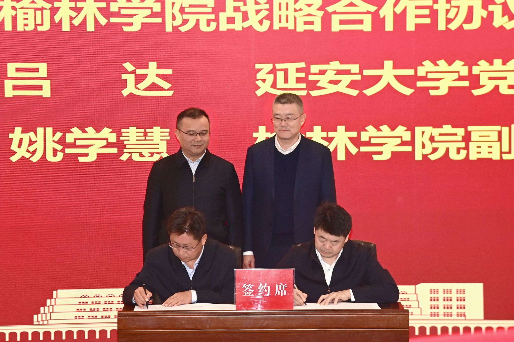 会上,延安大学与榆林学院举行了战略合作协议签约仪式,吕达、姚学慧分别代表延安大学、榆林学院签约。