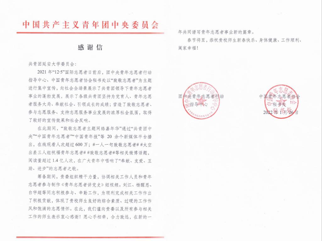 团中央青年志愿者行动指导中心和中国青年志愿者协会秘书处在信中指出,2021年“12·5”国际志愿者日前后,以“致敬志愿者”为主题进行的集中宣传,向社会全场景展示了共青团领导下青年志愿者事业的蓬勃发展,在广大青年中唱响了“奉献、友爱、互助、进步”的志愿者之歌。筹备期间,延安大学团委组织精干力量,协调相关工作人员和青年志愿者参与制作《青年志愿者讲党史》短视频,为顺利完成相关工作作出了积极贡献,体现了延安大学师生良好的综合素质、过硬的工作作风和饱满的志愿情怀。