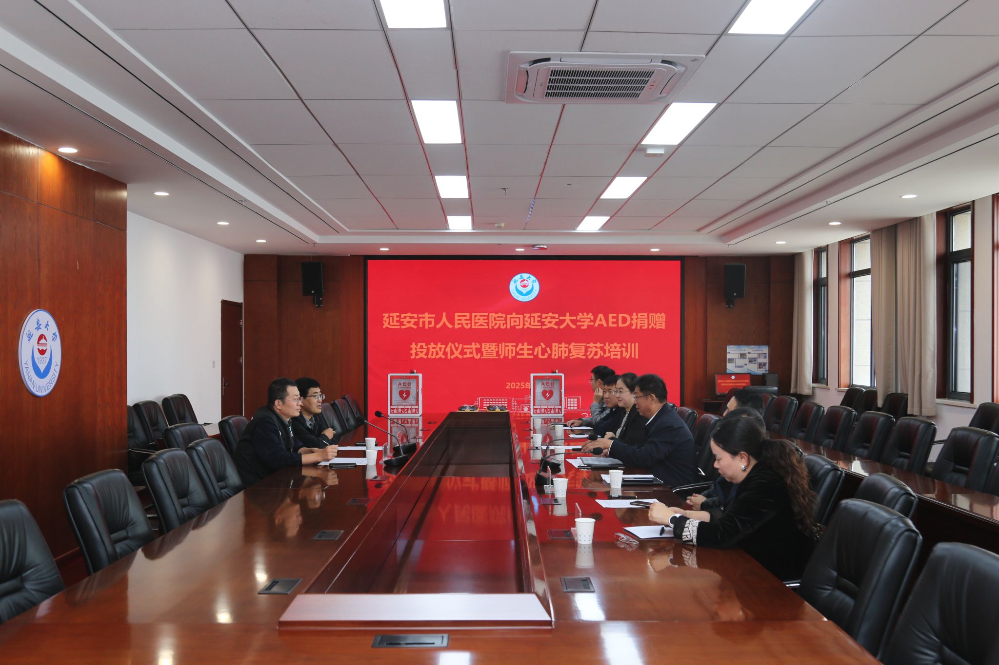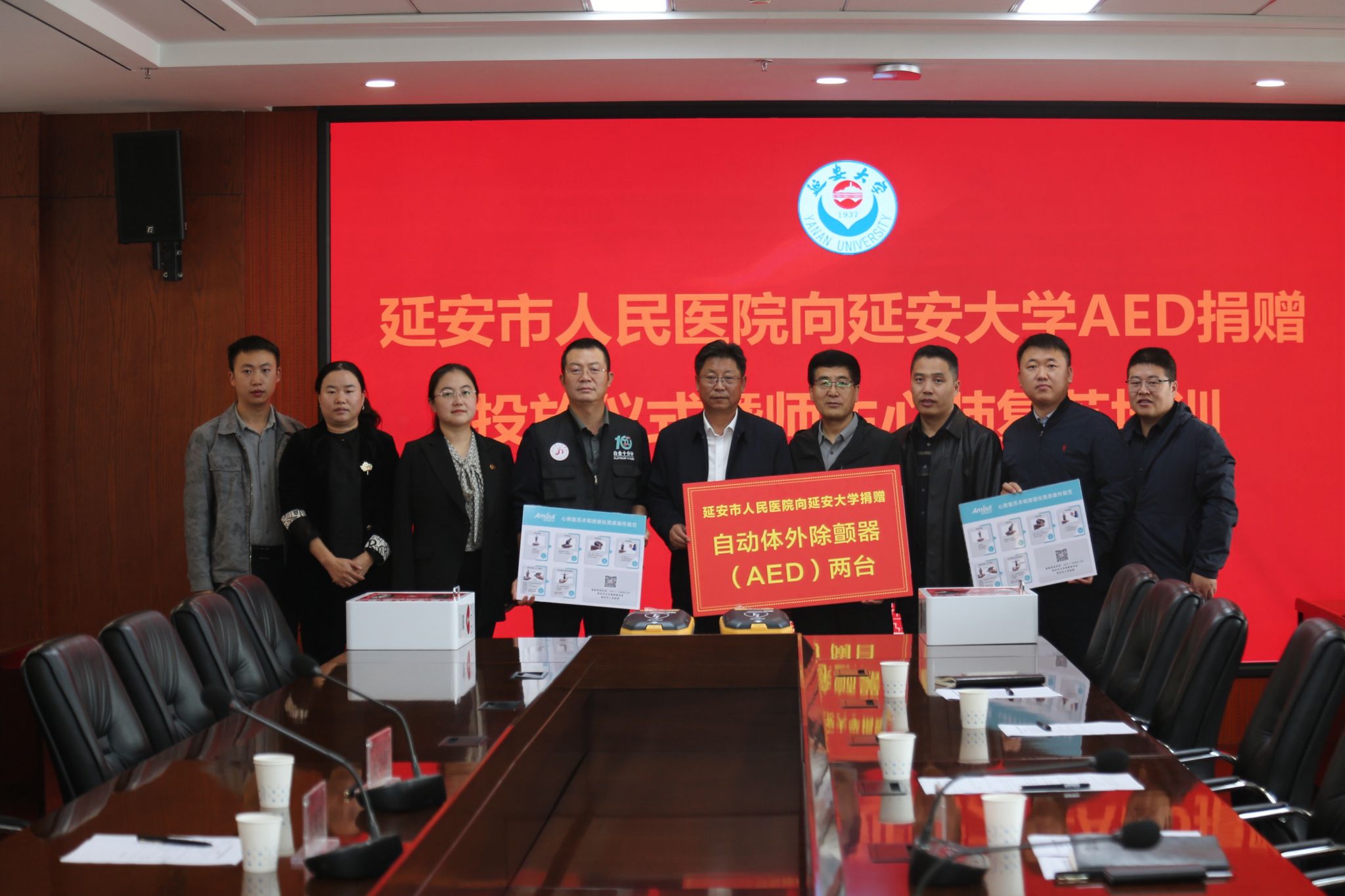 本网讯 9月25日上午,我校在行政楼七楼会议室举行延安市人民医院向延安大学捐赠AED(自动体外除颤仪)设备投放仪式。校党委副书记吕达,延安市志愿服务联合会副会长王小纲,延安市人民医院AED项目负责人张维涛出席仪式。仪式由校团委书记申圆圆主持。