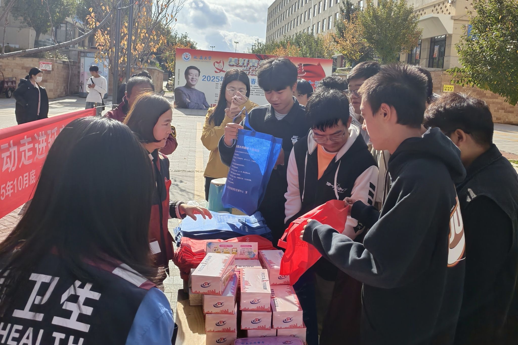 在新城校区商业街,各参与单位进行了防艾知识手册宣传和现场问答活动。同学们在轻松的氛围中深入了解艾滋病传播途径、防治措施及正确对待感染者的重要性,同时通过互动问答加深了对相关知识的理解,提升了自我保护意识和技能,树立“每个人是自己健康第一负责人”和“检测是知晓艾滋病感染的唯一途径”的理念。