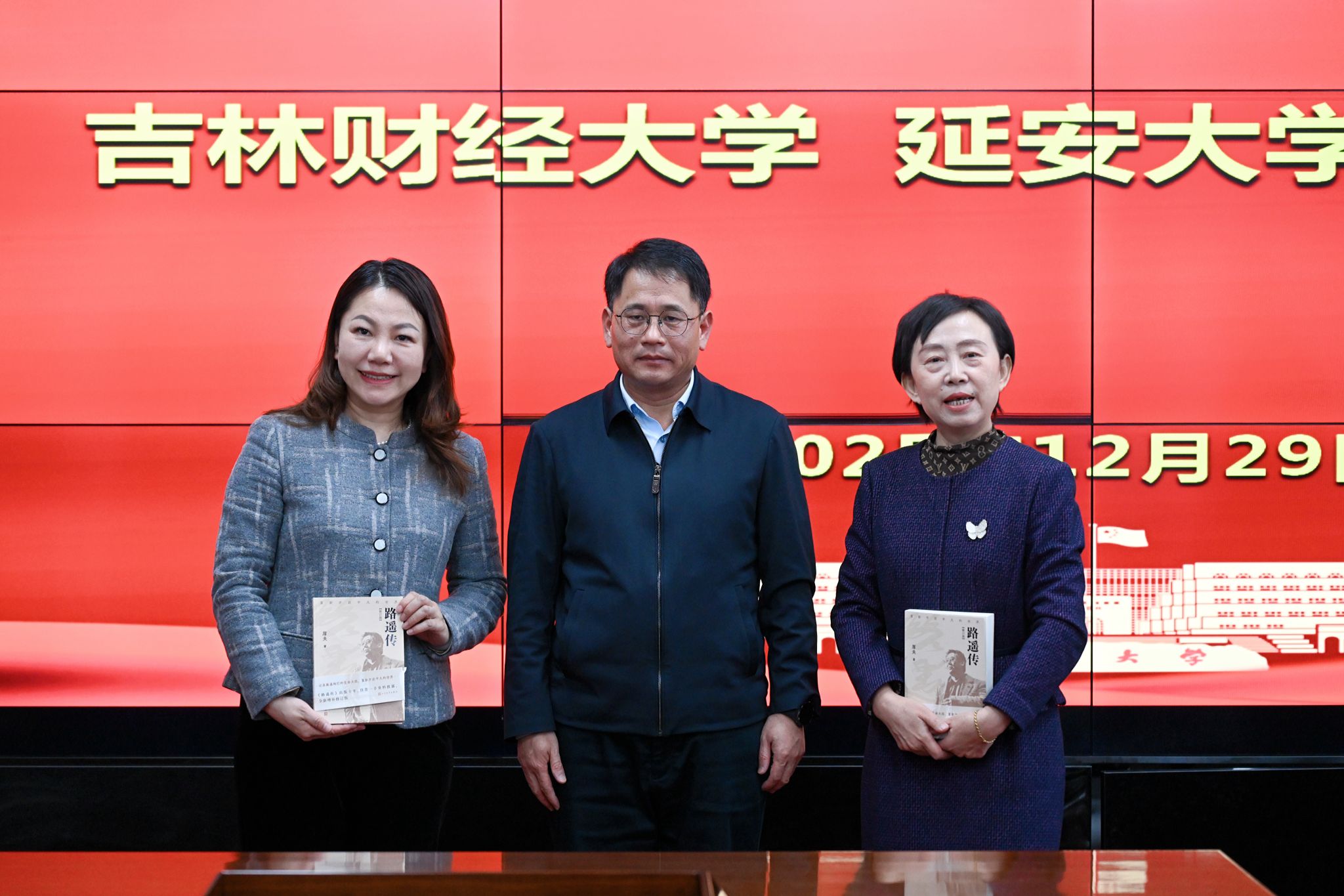 吕磊代表学校向吉林财经大学参会人员赠送《路遥传》。