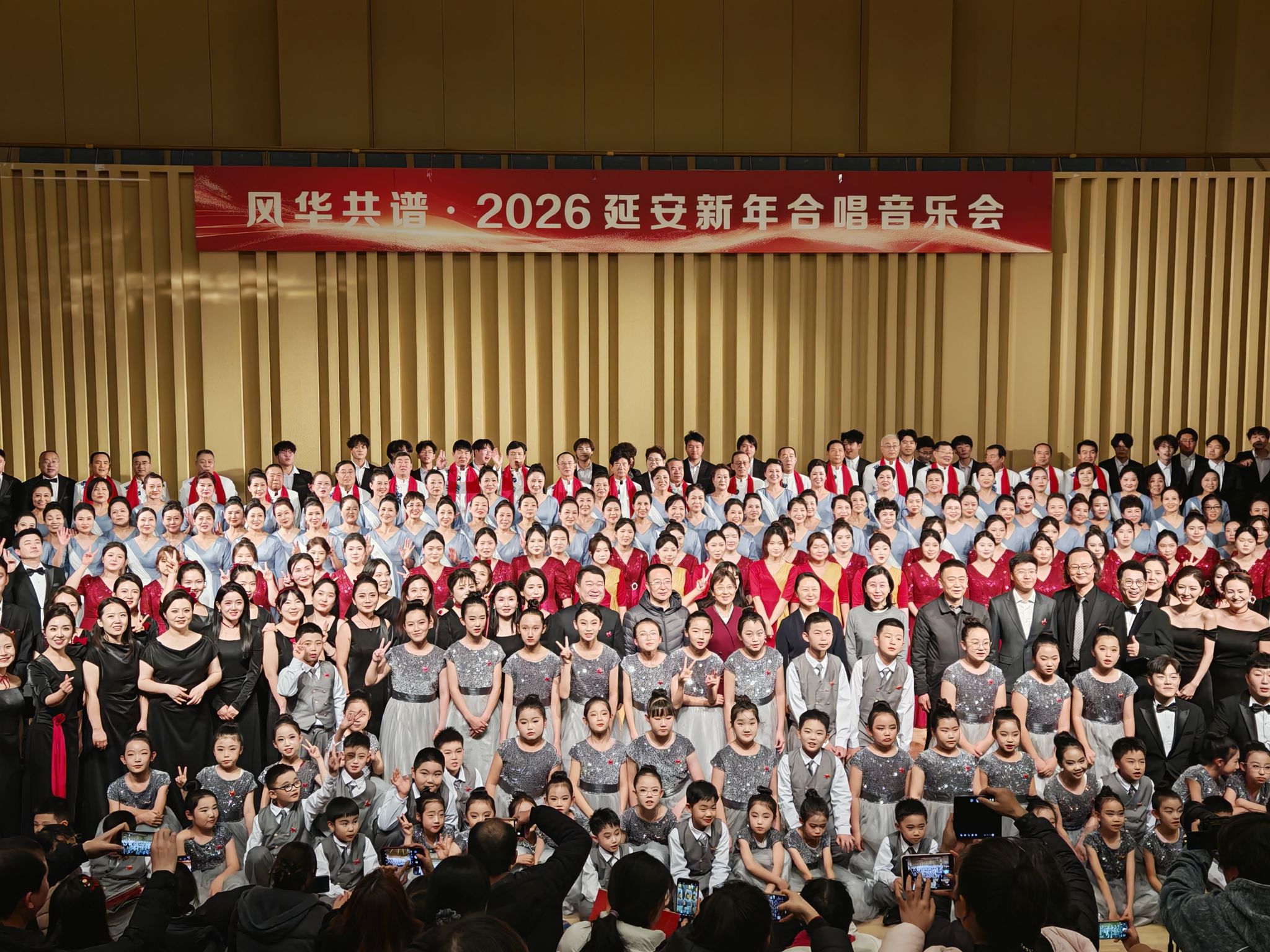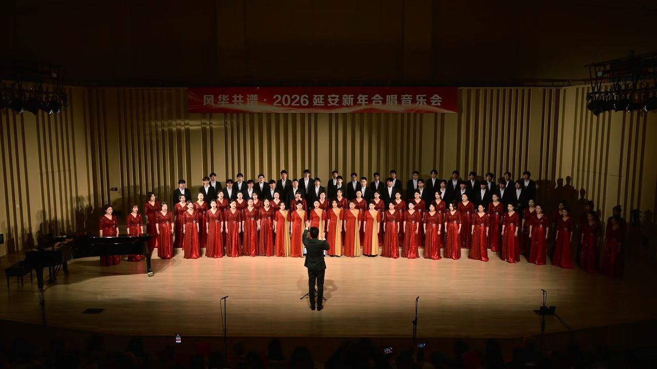 12月29日晚,由延安市委宣传部指导、市文联主办的“风华共谱·2026延安新年合唱音乐会”在延安大剧院隆重举行。延安市政协主席杨光远,市委常委、宣传部部长杨宏兰,延安大学鲁迅艺术学院党委书记董振文等与文艺界代表共同出席。延安大学鲁艺合唱团深度参与整场演出,倾情演绎了多首经典作品。合唱团以《新年好》《春节序曲》《陕北多壮丽》联唱热情开场,随后演绎了《夕烧》《赶牲灵》两首经典作品,以清澈而富有朝气的和声传递了对陕北大地的深情。在与爱乐鲁艺合唱团联袂演绎《满城烟花》后,音乐会在《壮美延安》与《我的祖国》的联唱中步入尾声。